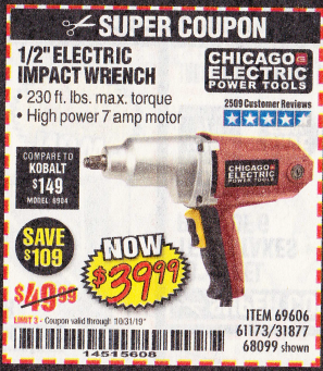 1/2" ELECTRIC IMPACT WRENCH Lot No. 31877/61173/68099/69606 Expired: 10/31/19 - $39.99 Coupon Code: '14515608'