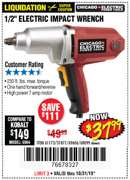 1/2" ELECTRIC IMPACT WRENCH Lot No. 31877/61173/68099/69606 Expired: 7/31/19 - $39.99 Coupon Code: '7126284'
