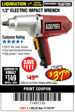 1/2" ELECTRIC IMPACT WRENCH Lot No. 31877/61173/68099/69606 Expired: 11/10/19 - $37.99 Coupon Code: '71497330'