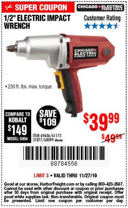 1/2" ELECTRIC IMPACT WRENCH Lot No. 31877/61173/68099/69606 Expired: 11/27/19 - $39.99 Coupon Code: '88784556'