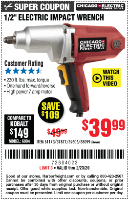 1/2" ELECTRIC IMPACT WRENCH Lot No. 31877/61173/68099/69606 Expired: 2/23/20 - $39.99 Coupon Code: '72604023'