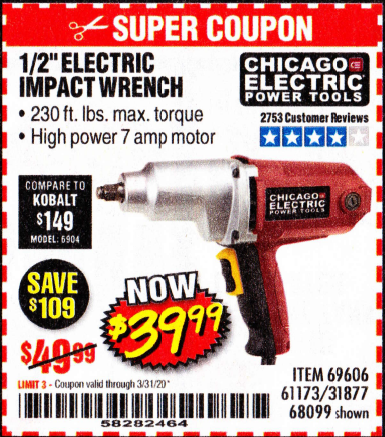 1/2" ELECTRIC IMPACT WRENCH Lot No. 31877/61173/68099/69606 Expired: 3/31/20 - $39.99 Coupon Code: '58282464'