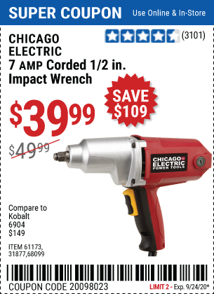 1/2" ELECTRIC IMPACT WRENCH Lot No. 31877/61173/68099/69606 Expired: 9/24/20 - $39.99 Coupon Code: '20098023'