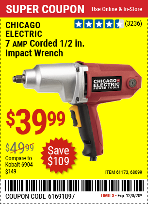 1/2" ELECTRIC IMPACT WRENCH Lot No. 31877/61173/68099/69606 Expired: 12/3/20 - $39.99 Coupon Code: '61691897'