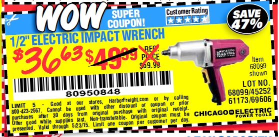 1/2" ELECTRIC IMPACT WRENCH Lot No. 31877/61173/68099/69606 Expired: 5/23/15 - $36.63 Coupon Code: '80950848'