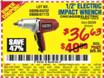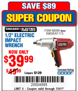 1/2" ELECTRIC IMPACT WRENCH Lot No. 31877/61173/68099/69606 Expired: 7/3/17 - $39.99 Coupon Code: '20504995'
