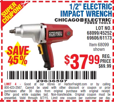 1/2" ELECTRIC IMPACT WRENCH Lot No. 31877/61173/68099/69606 Expired: 8/7/15 - $37.99 Coupon Code: '29636597'