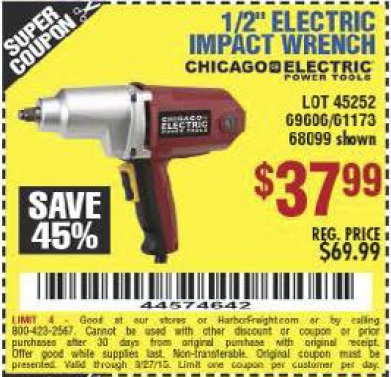 1/2" ELECTRIC IMPACT WRENCH Lot No. 31877/61173/68099/69606 Expired: 4/4/16 - $39.99 Coupon Code: '45756696'