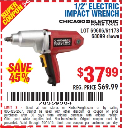 1/2" ELECTRIC IMPACT WRENCH Lot No. 31877/61173/68099/69606 Expired: 10/1/15 - $37.99 Coupon Code: '31073286'