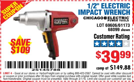 1/2" ELECTRIC IMPACT WRENCH Lot No. 31877/61173/68099/69606 Expired: 3/1/16 - $39.99 Coupon Code: '25145788'