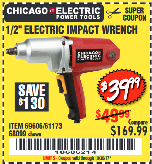 1/2" ELECTRIC IMPACT WRENCH Lot No. 31877/61173/68099/69606 Expired: 10/30/17 - $39.99 Coupon Code: '10686214'