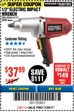1/2" ELECTRIC IMPACT WRENCH Lot No. 31877/61173/68099/69606 Expired: 11/30/17 - $37.99 Coupon Code: '12508047'
