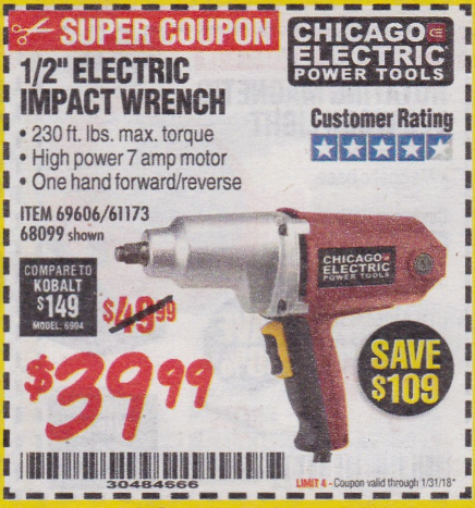 1/2" ELECTRIC IMPACT WRENCH Lot No. 31877/61173/68099/69606 Expired: 1/31/18 - $39.99 Coupon Code: '30484666'