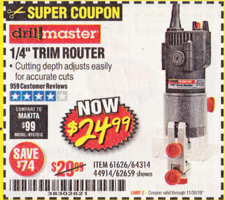1/4” TRIM ROUTER Lot No. 61626/62659/44914 Expired: 11/30/19 - $0 Coupon Code: '38302621'