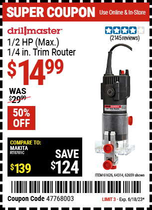 1/4” TRIM ROUTER Lot No. 61626/62659/44914 Expired: 6/18/23 - $14.99 Coupon Code: '47768003'
