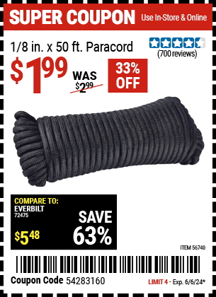 1/8 IN. X 50 FT. PARACORD Lot No. 56740 Expired: 6/6/24 - $1.99 Coupon Code: '54283160'