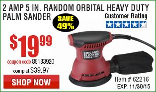 2 AMP 5 IN. RANDOM ORBITAL HEAVY DUTY PALM SANDER Lot No. 62216 Expired: 11/30/15 - $19.99 Coupon Code: '85183920'