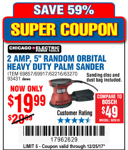 2 AMP 5 IN. RANDOM ORBITAL HEAVY DUTY PALM SANDER Lot No. 62216 Expired: 12/25/17 - $19.99 Coupon Code: '17962629'