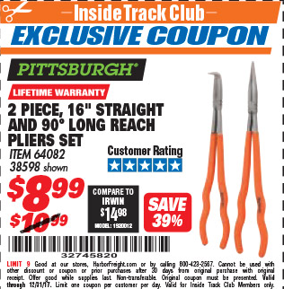 ITC 2 PIECE, 16" LONG REACH PLIERS SET Lot No. 38598/64082 Expired: 10/31/18 - $8.99 Coupon Code: '39981155'