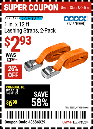 2 PIECE 1" X 12 FT. LASHING STRAPS Lot No. 40058/63053/67386 Expired: 4/21/24 - $2.93 Coupon Code: '48686929'