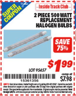 ITC 2 PIECE 500 WATT REPLACEMENT HALOGEN BULBS Lot No. 95457 Expired: 7/31/16 - $1.99 Coupon Code: '38140209'