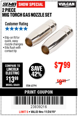 2 PIECE MIG TORCH GAS NOZZLE SET Lot No. 63794 Expired: 11/24/19 - $7.99 Coupon Code: '23839216'