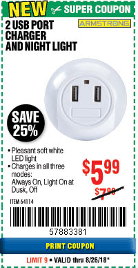 2 USB PORT CHARGER AND NIGHT LIGHT Lot No. 64114 Expired: 8/26/18 - $5.99 Coupon Code: '57883381'