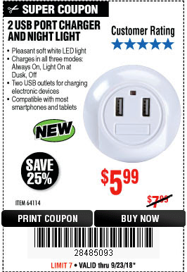 2 USB PORT CHARGER AND NIGHT LIGHT Lot No. 64114 Expired: 9/23/18 - $5.99 Coupon Code: '28485093'