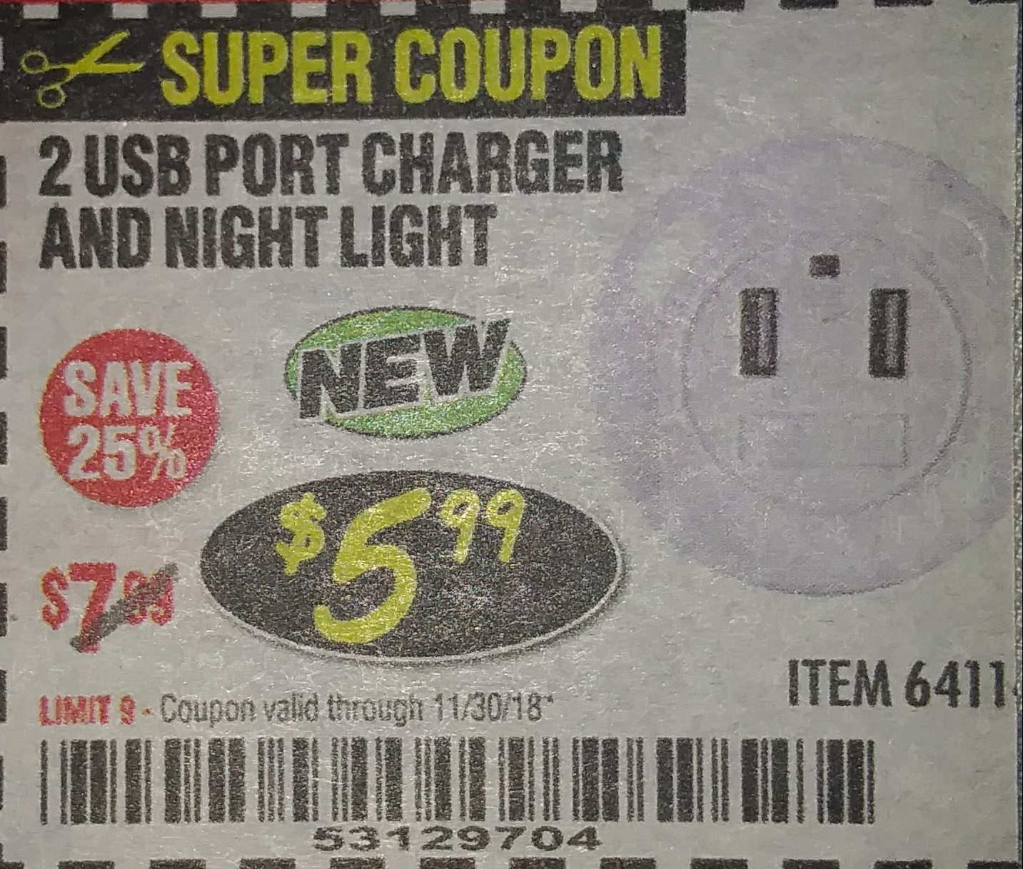 2 USB PORT CHARGER AND NIGHT LIGHT Lot No. 64114 Expired: 11/30/18 - $5.99 Coupon Code: '53129704'