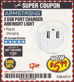 2 USB PORT CHARGER AND NIGHT LIGHT Lot No. 64114 Expired: 10/31/19 - $5.99 Coupon Code: '68980520'