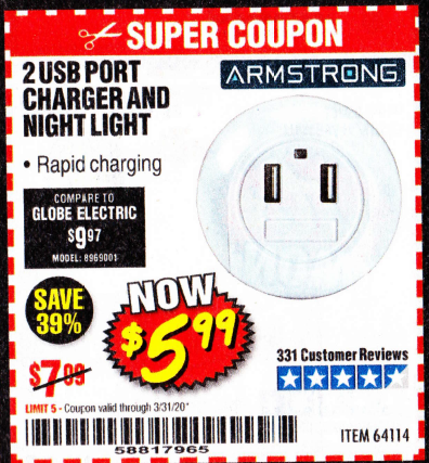 2 USB PORT CHARGER AND NIGHT LIGHT Lot No. 64114 Expired: 3/31/20 - $5.99 Coupon Code: '58817965'