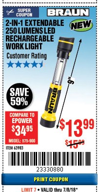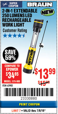 2-IN-1 EXTENDABLE 250 LUMENS LED RECHARGEABLE WORK LIGHT Lot No. 63983 Expired: 7/8/18 - $13.99 Coupon Code: '23330880'