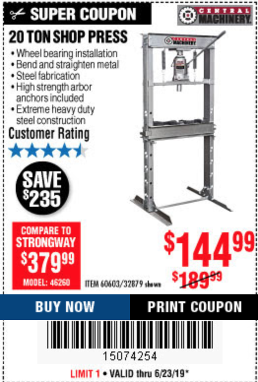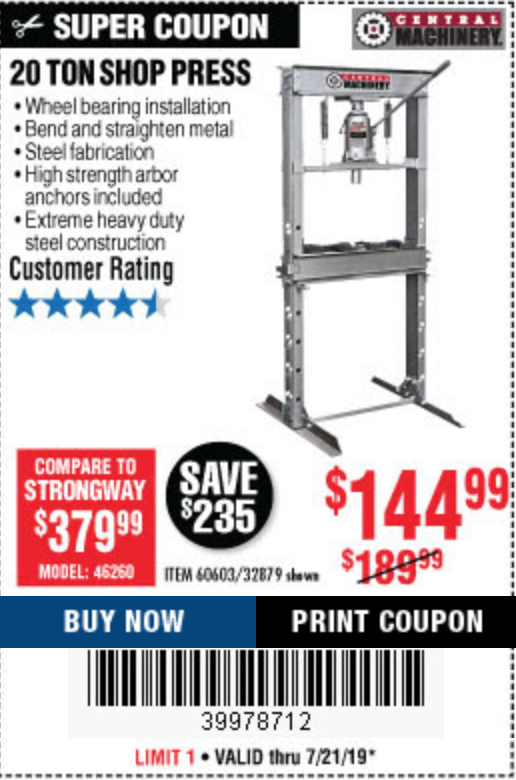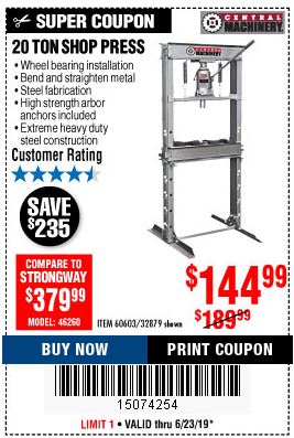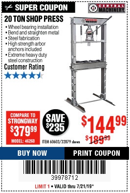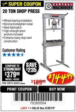 20 TON SHOP PRESS Lot No. 32879/60603 Expired: 6/30/19 - $144.99 Coupon Code: '70265554'