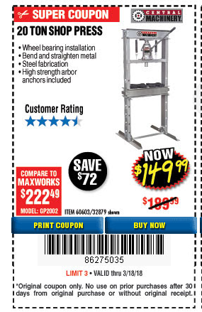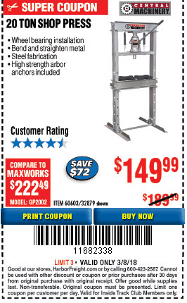 20 TON SHOP PRESS Lot No. 32879/60603 Expired: 3/18/18 - $149.99 Coupon Code: '86275035'