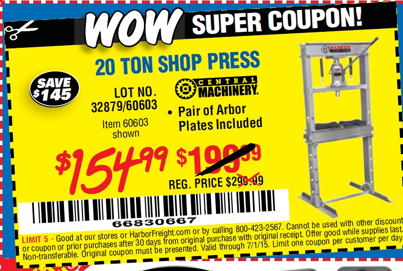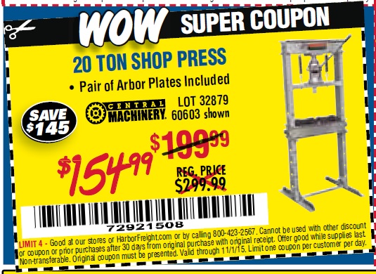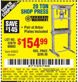 20 TON SHOP PRESS Lot No. 32879/60603 Expired: 7/1/15 - $154.99 Coupon Code: '66830667'