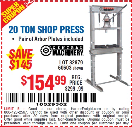 20 TON SHOP PRESS Lot No. 32879/60603 Expired: 9/5/15 - $154.99 Coupon Code: '10529302'