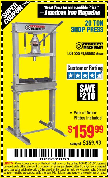 20 TON SHOP PRESS Lot No. 32879/60603 Expired: 5/1/16 - $159.99 Coupon Code: '82067851'
