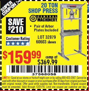 20 TON SHOP PRESS Lot No. 32879/60603 Expired: 12/31/16 - $159.99 Coupon Code: '37568058'