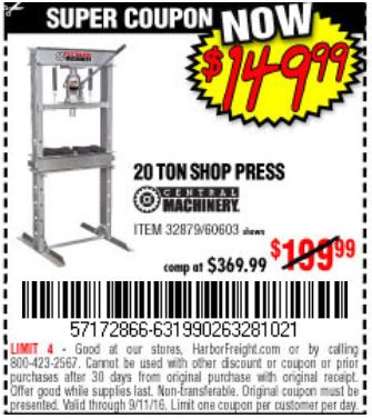 20 TON SHOP PRESS Lot No. 32879/60603 Expired: 8/31/17 - $149.99 Coupon Code: '29029704'