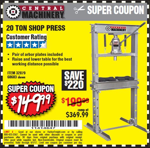 20 TON SHOP PRESS Lot No. 32879/60603 Expired: 6/1/17 - $149.99 Coupon Code: '11414647'