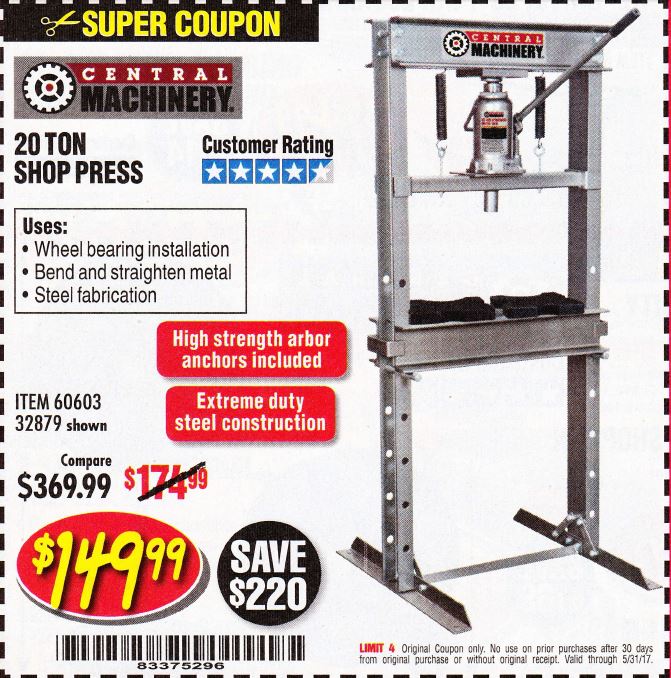 20 TON SHOP PRESS Lot No. 32879/60603 Expired: 5/31/17 - $149.99 Coupon Code: '83375296'
