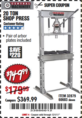 20 TON SHOP PRESS Lot No. 32879/60603 Expired: 10/31/17 - $149.99 Coupon Code: '32470965'