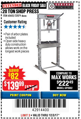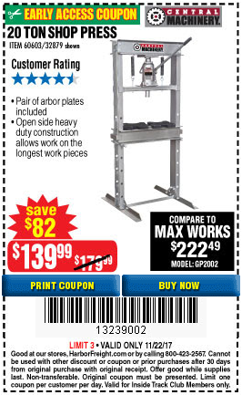 20 TON SHOP PRESS Lot No. 32879/60603 Expired: 11/22/17 - $139.99 Coupon Code: '13239002'