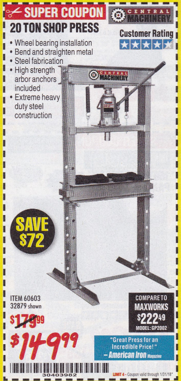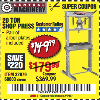 20 TON SHOP PRESS Lot No. 32879/60603 Expired: 1/31/18 - $149.99 Coupon Code: '30403982'