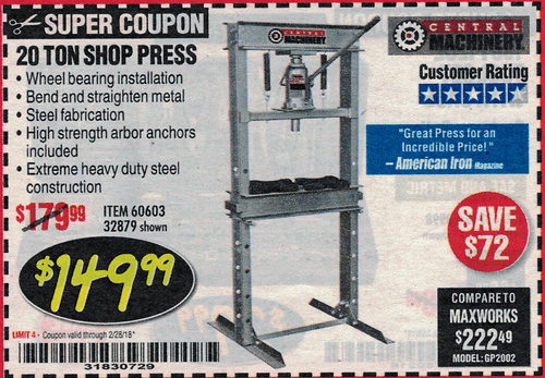 20 TON SHOP PRESS Lot No. 32879/60603 Expired: 2/28/18 - $149.99 Coupon Code: '31830729'
