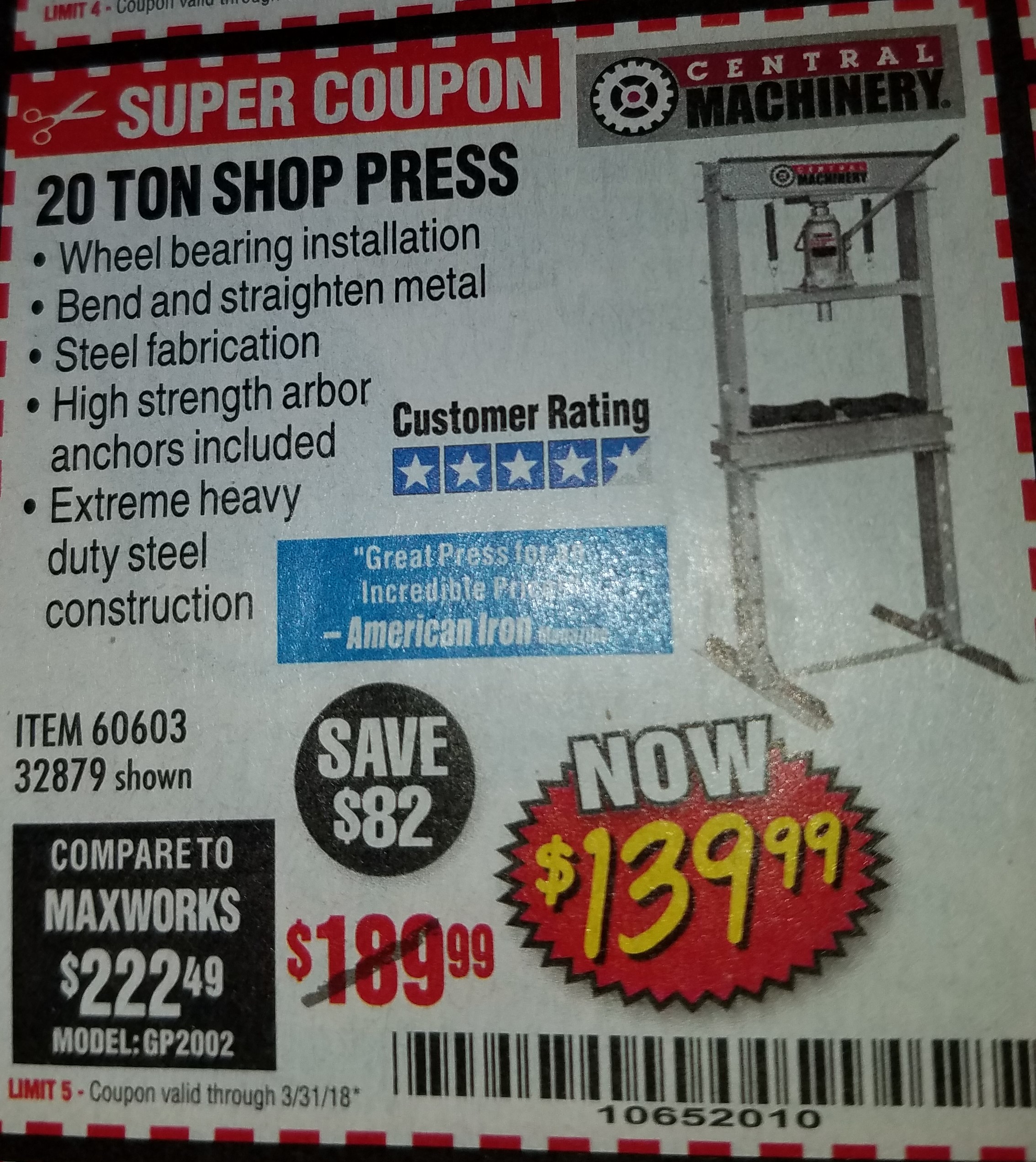 20 TON SHOP PRESS Lot No. 32879/60603 Expired: 3/31/18 - $139.99 Coupon Code: '10652010'