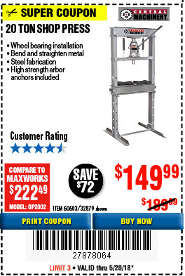 20 TON SHOP PRESS Lot No. 32879/60603 Expired: 5/20/18 - $149.99 Coupon Code: '27878064'