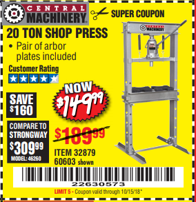 20 TON SHOP PRESS Lot No. 32879/60603 Expired: 10/15/18 - $149.99 Coupon Code: '22630573'