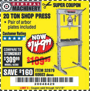 20 TON SHOP PRESS Lot No. 32879/60603 Expired: 10/1/18 - $149.99 Coupon Code: '20048429'
