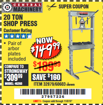 20 TON SHOP PRESS Lot No. 32879/60603 Expired: 11/6/18 - $149.99 Coupon Code: '27957226'